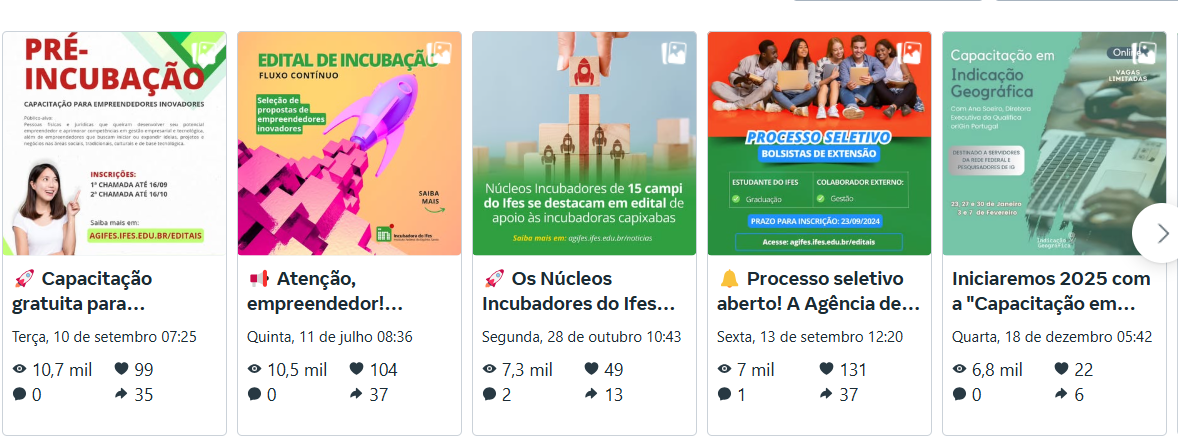 O Instagram foi o principal canal para interação dinâmica e divulgação rápida. Com publicações em feed, stories e reels, a plataforma destacou eventos institucionais, chamadas para editais, conquistas do Ifes no campo da inovação e boas práticas em propriedade intelectual.