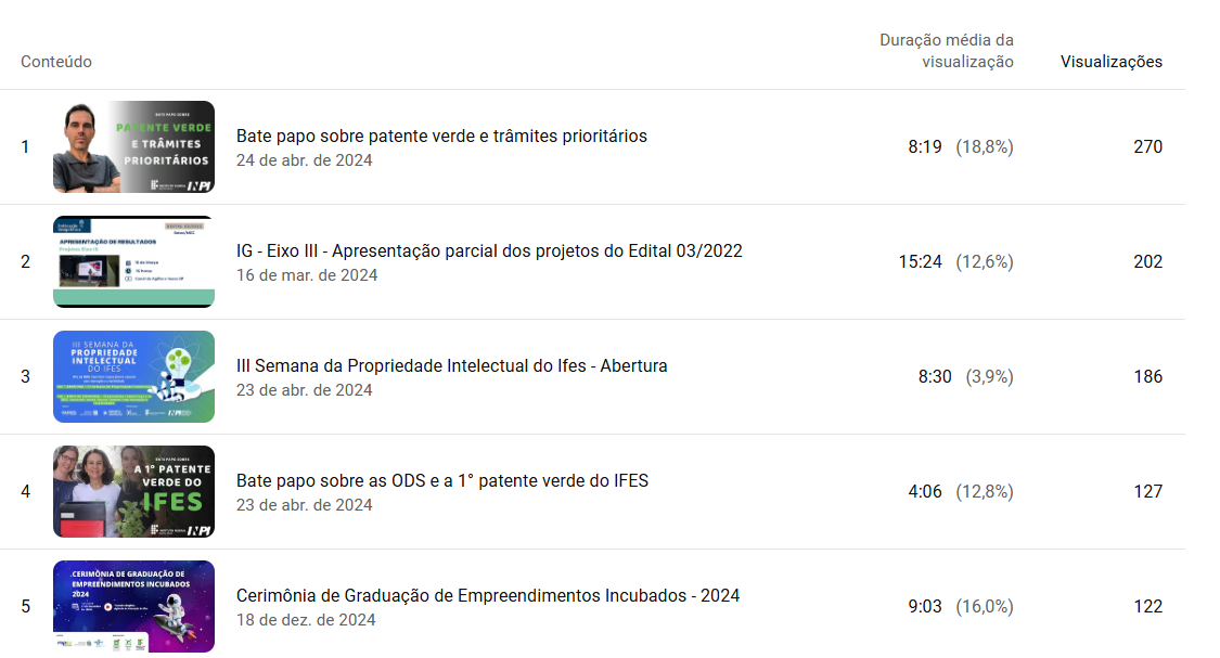 O YouTube funcionou como um repositório de conhecimento e capacitação, oferecendo transmissões ao vivo, vídeos explicativos e gravações de eventos como a Semana da Propriedade Intelectual. Conteúdos sobre empreendedorismo, inovação e orientações sobre propriedade intelectual foram disponibilizados para acesso remoto e contínuo, tornando a plataforma um importante canal de aprendizado.