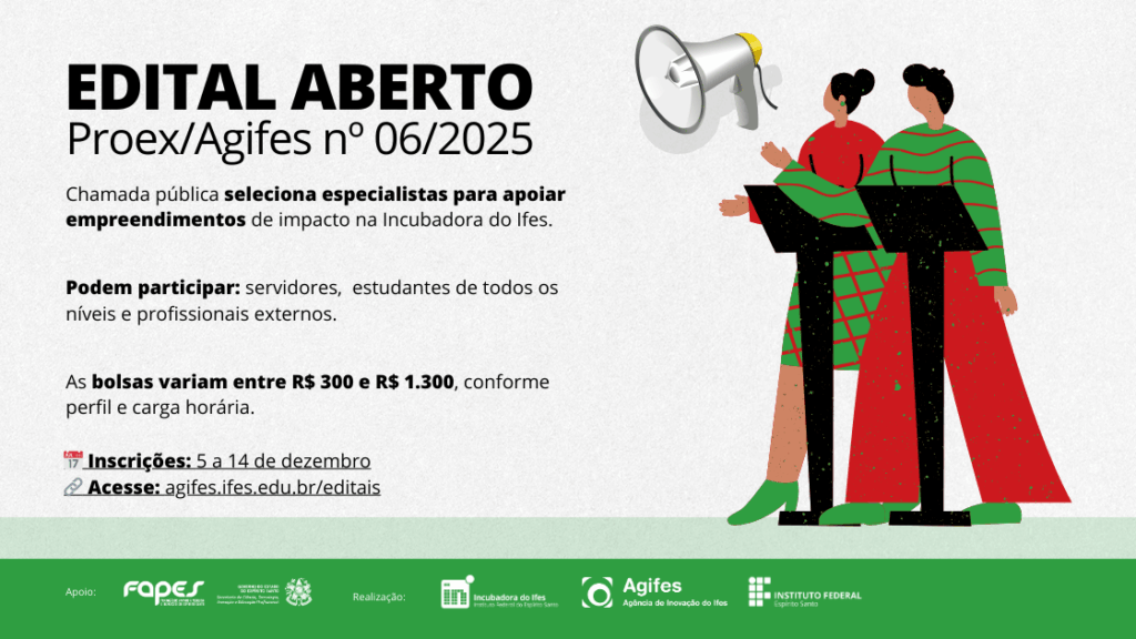 Edital seleciona especialistas para apoiar empreendimentos de impacto socioambiental na Incubadora do Ifes A Chamada Pública selecionará profissionais para apoiar projetos aprovados no edital da Fapes nº 06/2025 – NISA…